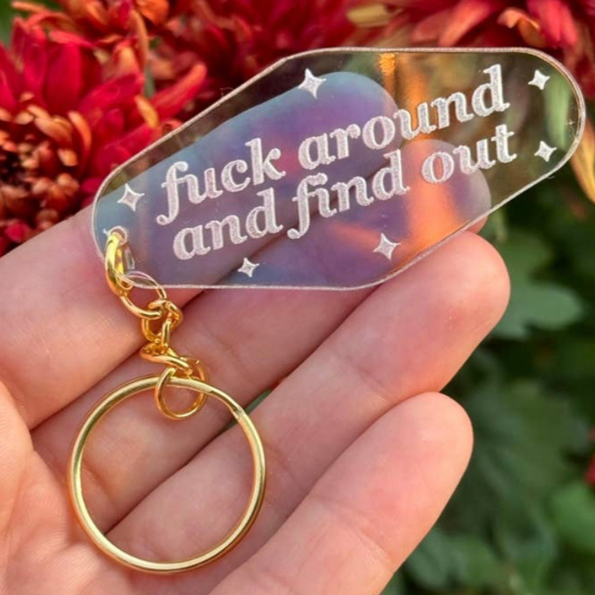 It is made in house with my laser in iridescent acrylic. Iridescent is a pretty colorshift acrylic that is translucent. It’s super lightweight and very adorable.