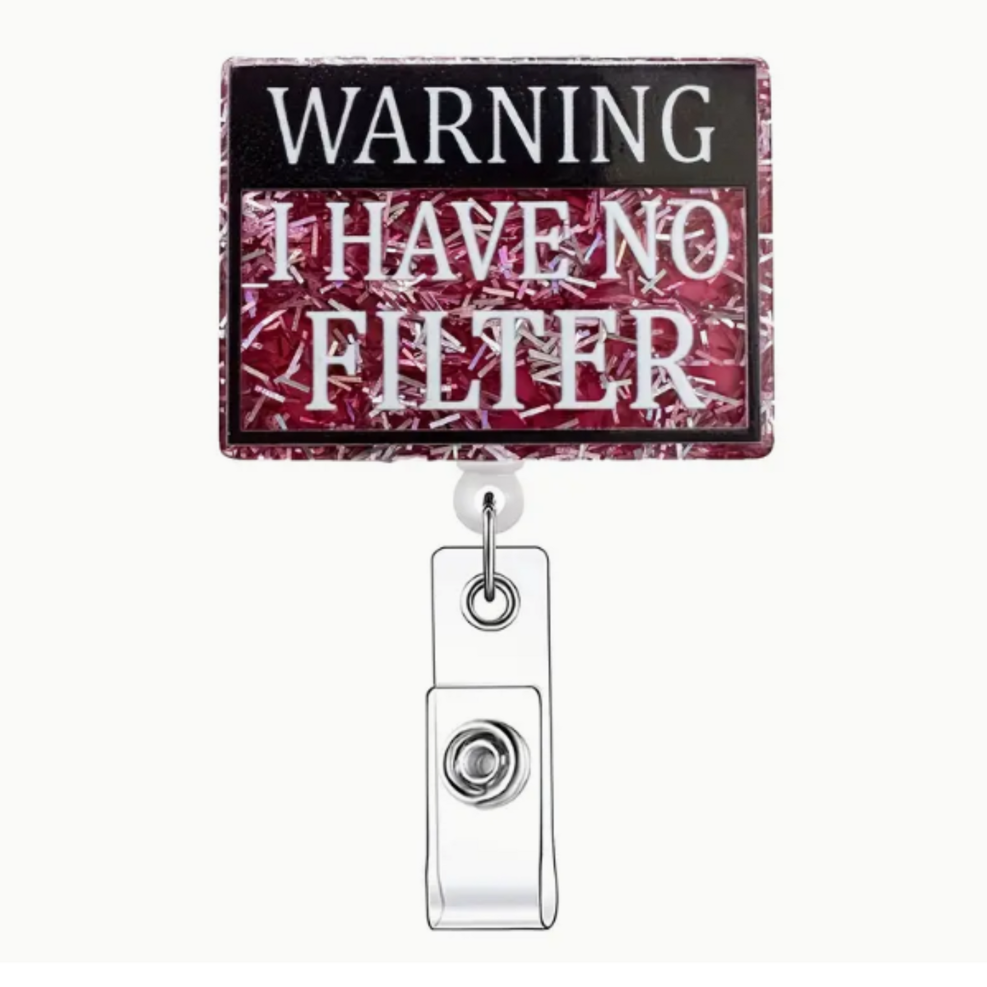 WARNING I HAVE NO FILTER ID badge reel, 360 swivel, acrylic glitter