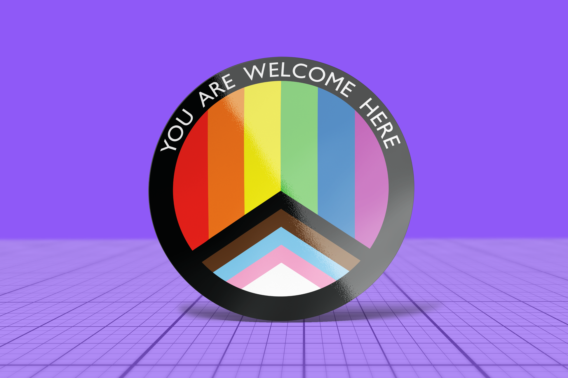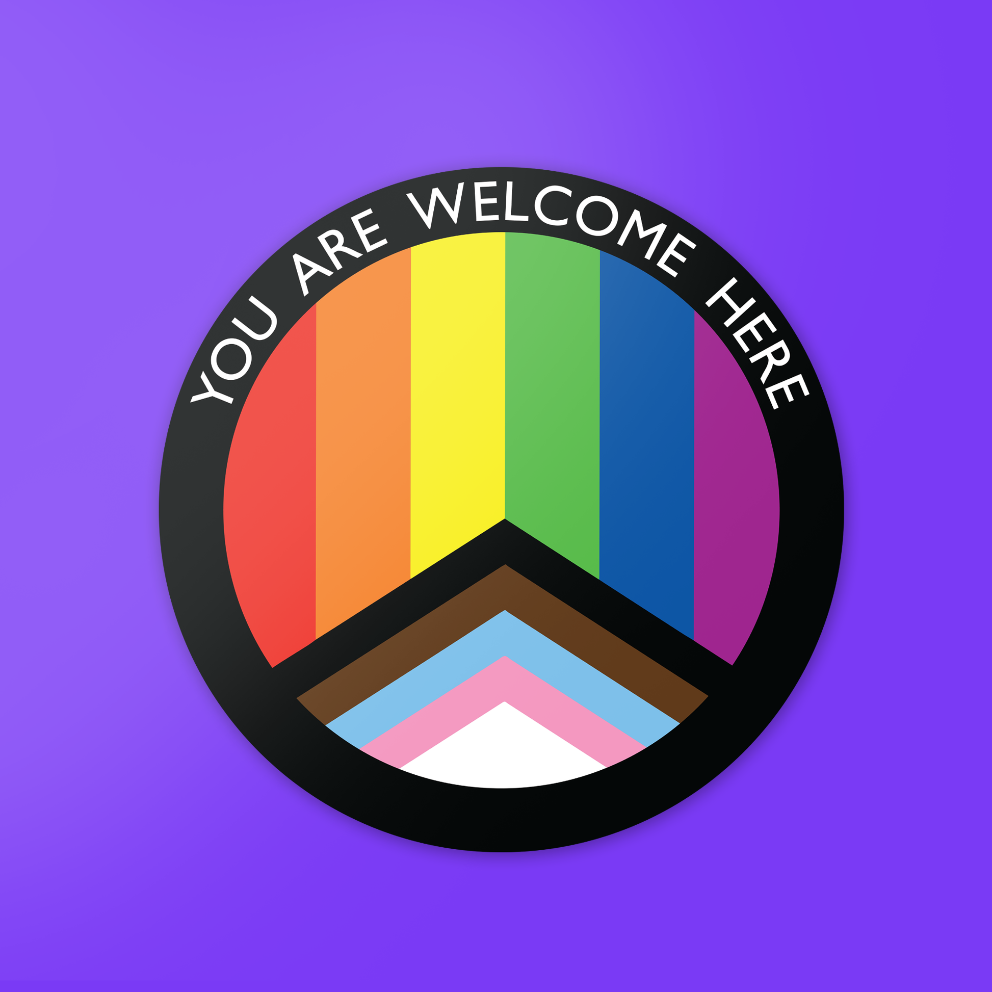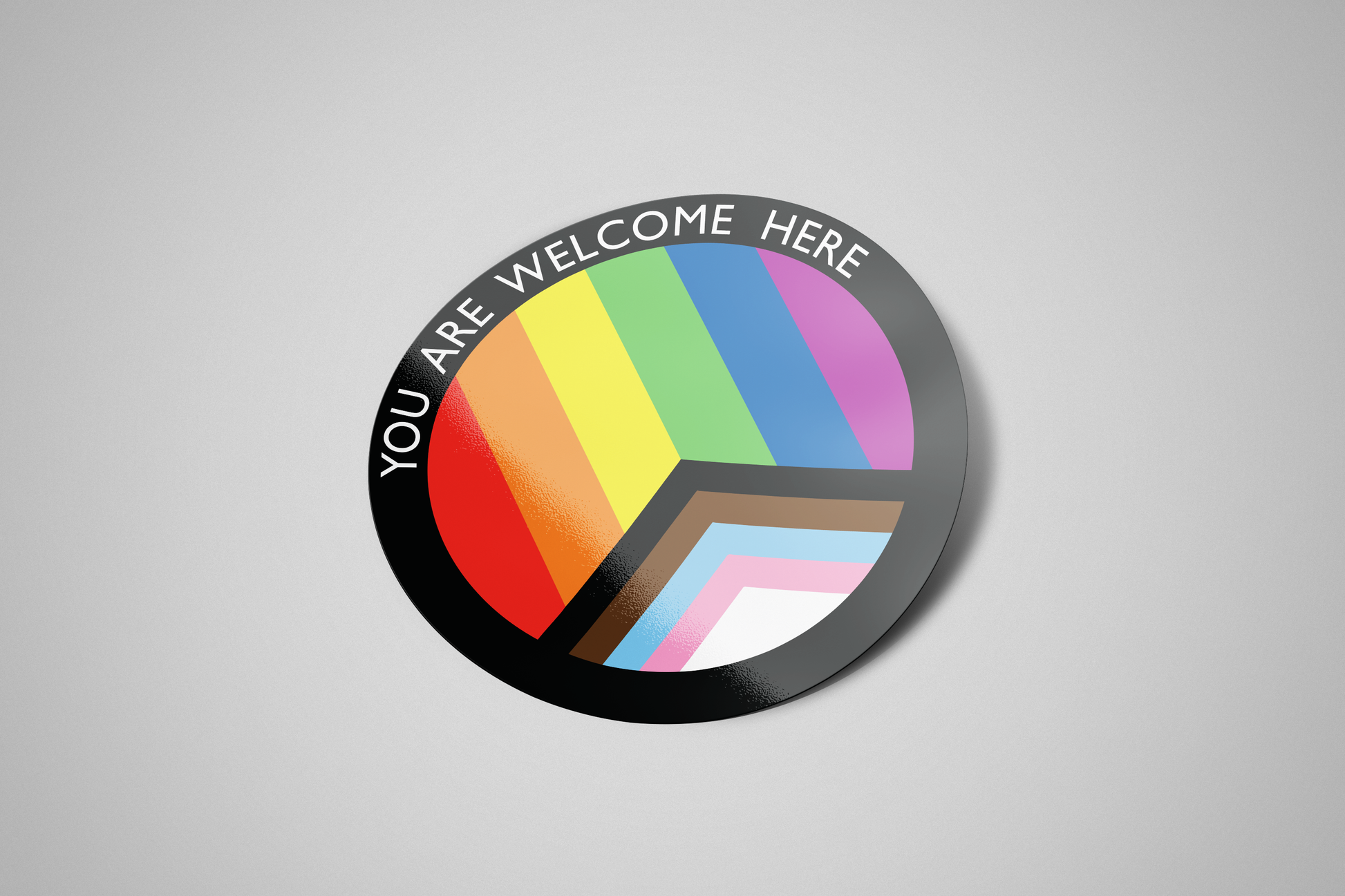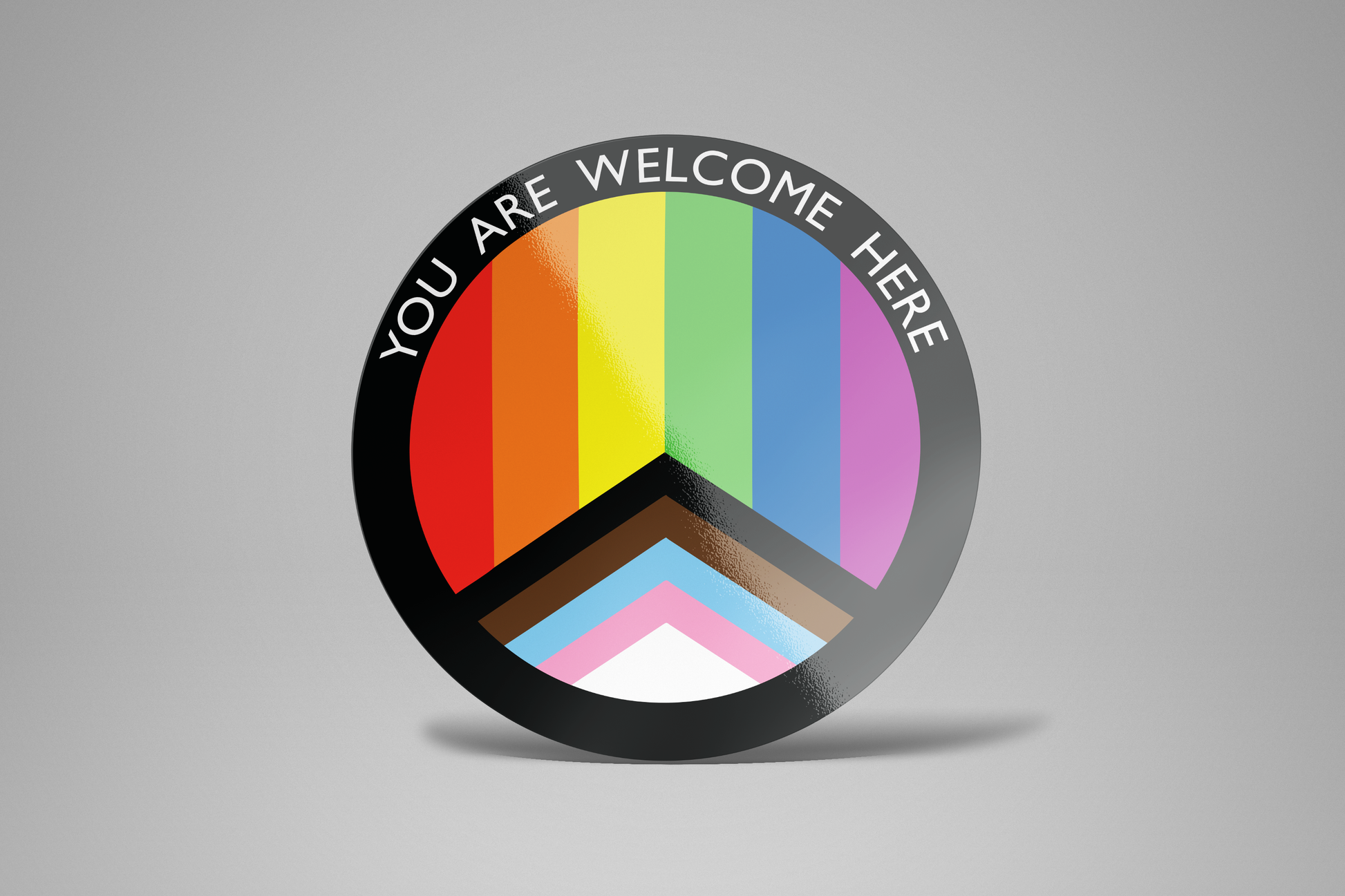 This beautiful, brilliantly printed progress flag window cling welcomes LGBTQ+ people.