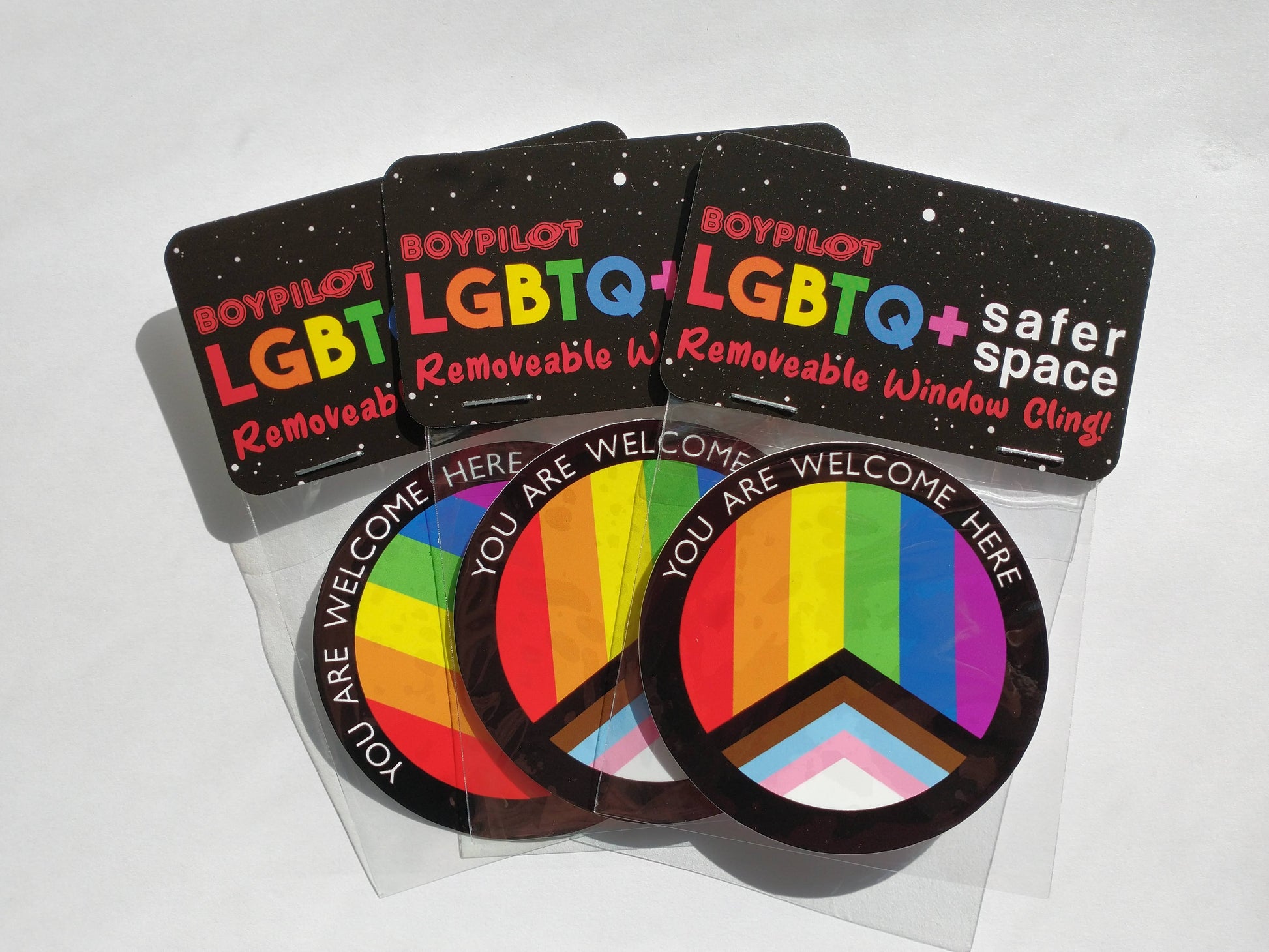 One cling is available for free for display in your own shop. Tester clings will not have retail packaging. Welcome LGBTQ+ customers to your shop by displaying this cling on your window or door! Just select the tester to add to your cart.