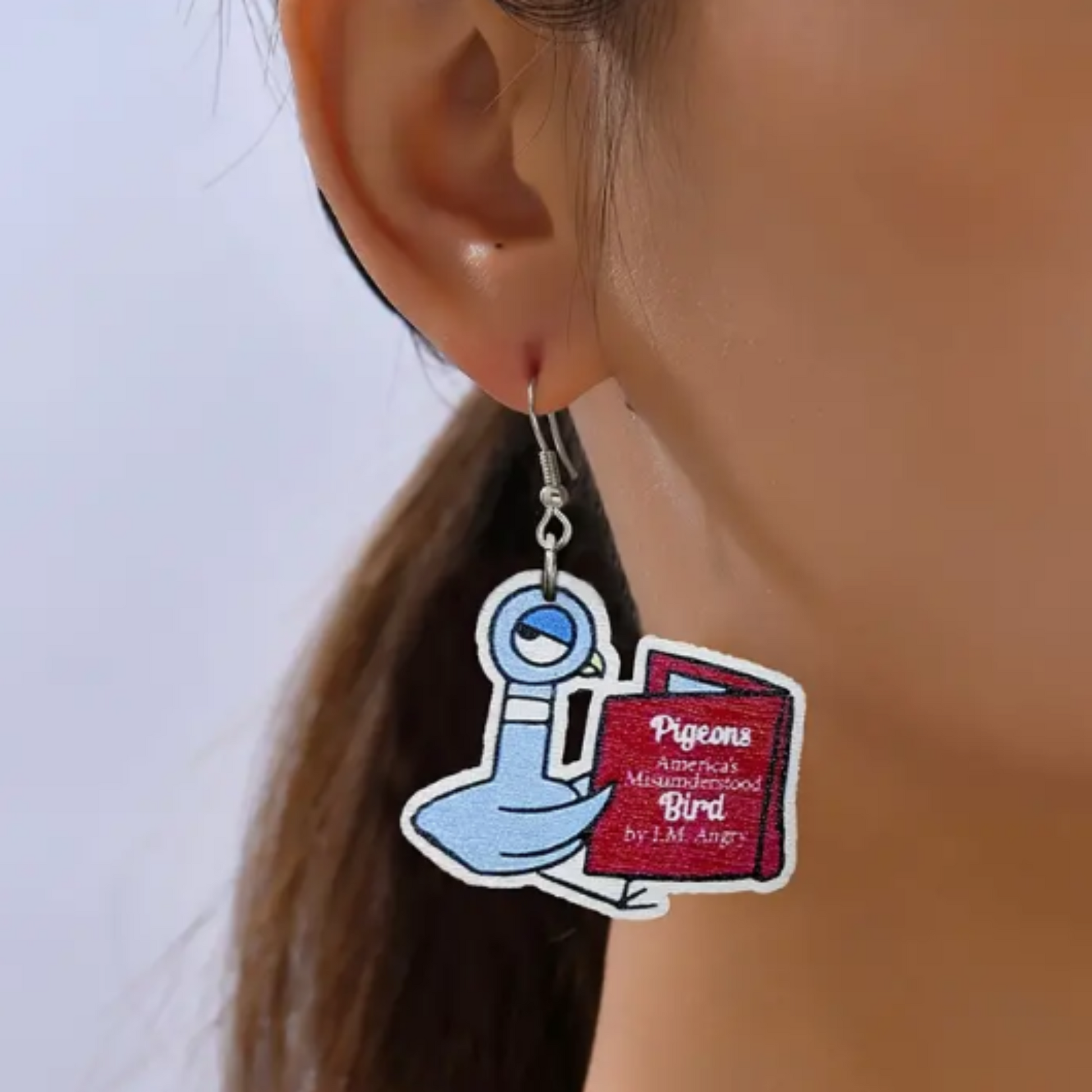 Adorable wood earrings of that dang pigeon reading a book called "Pigeons: America's Most Misunderstood Bird." 2.36 X 1.97 inches