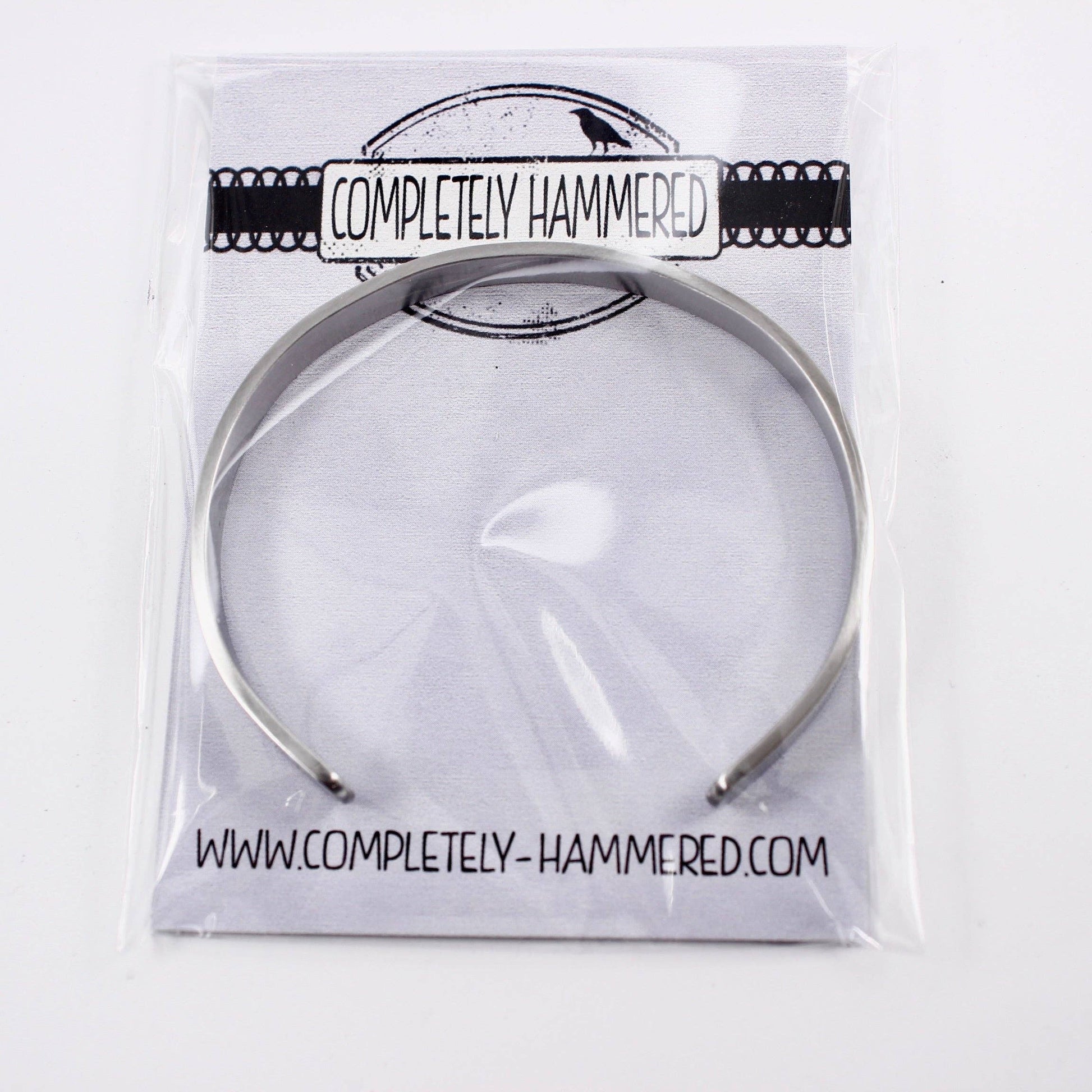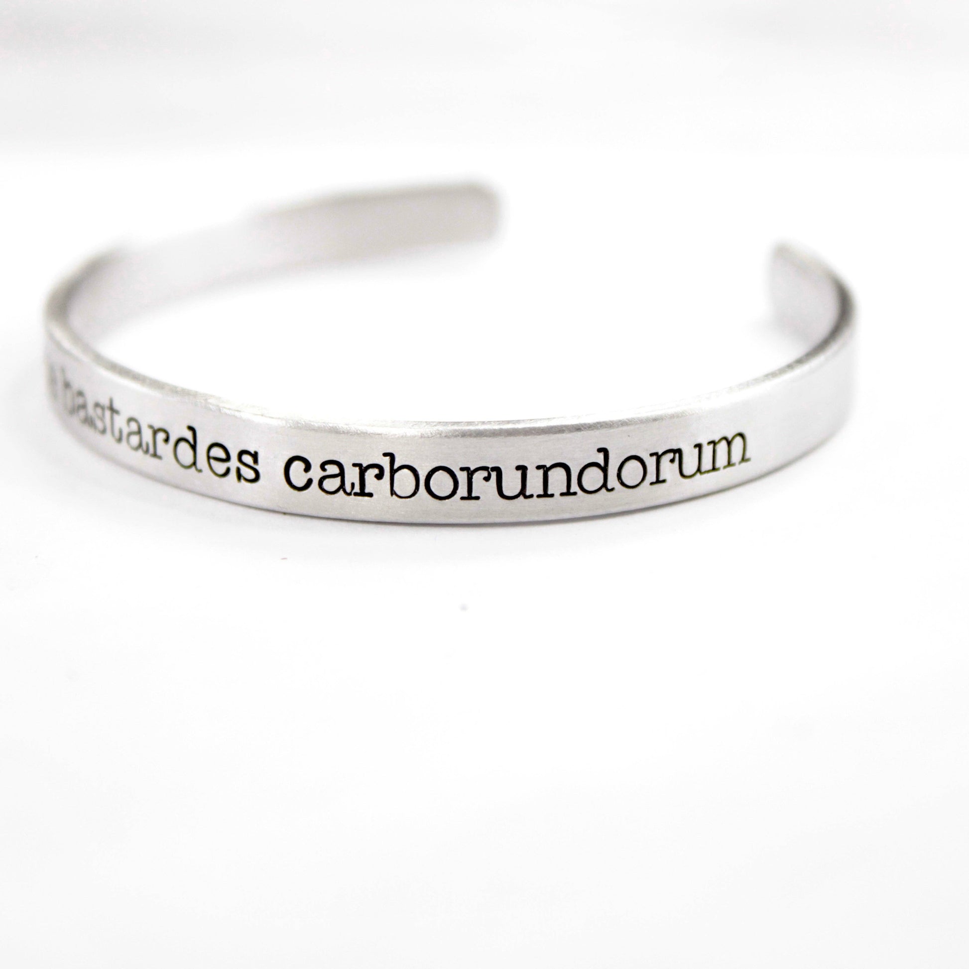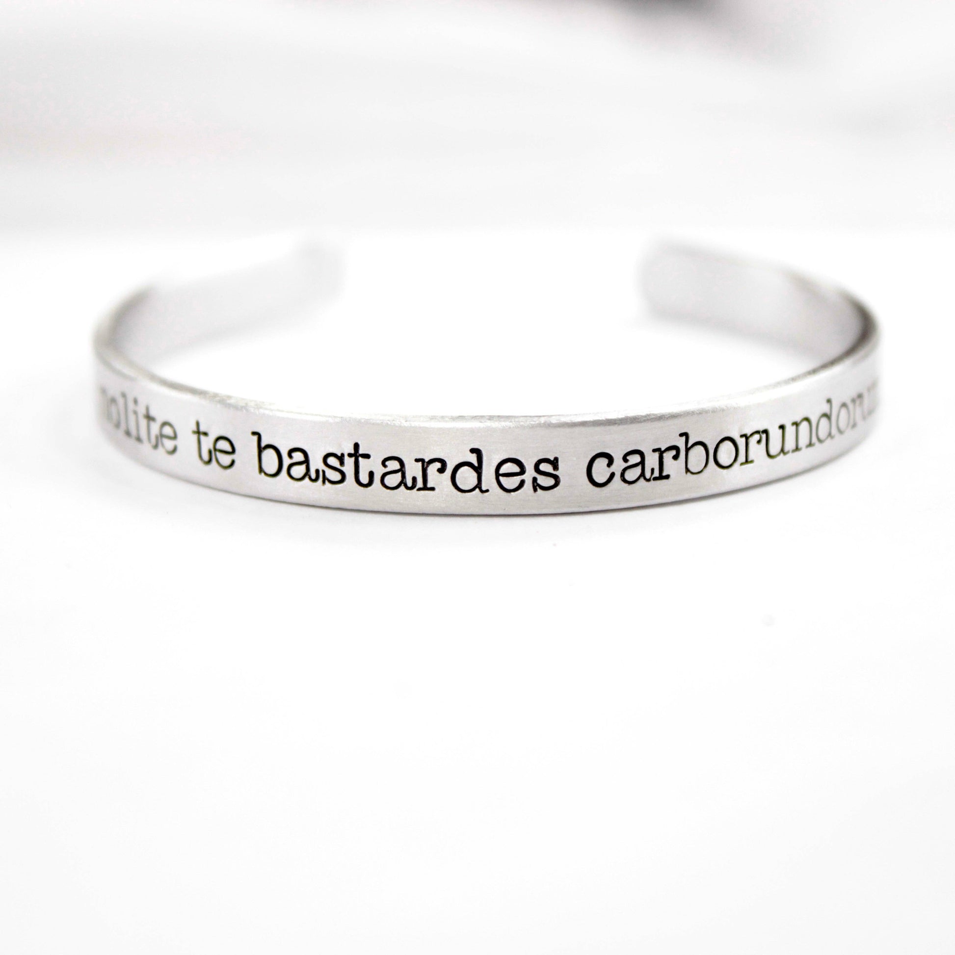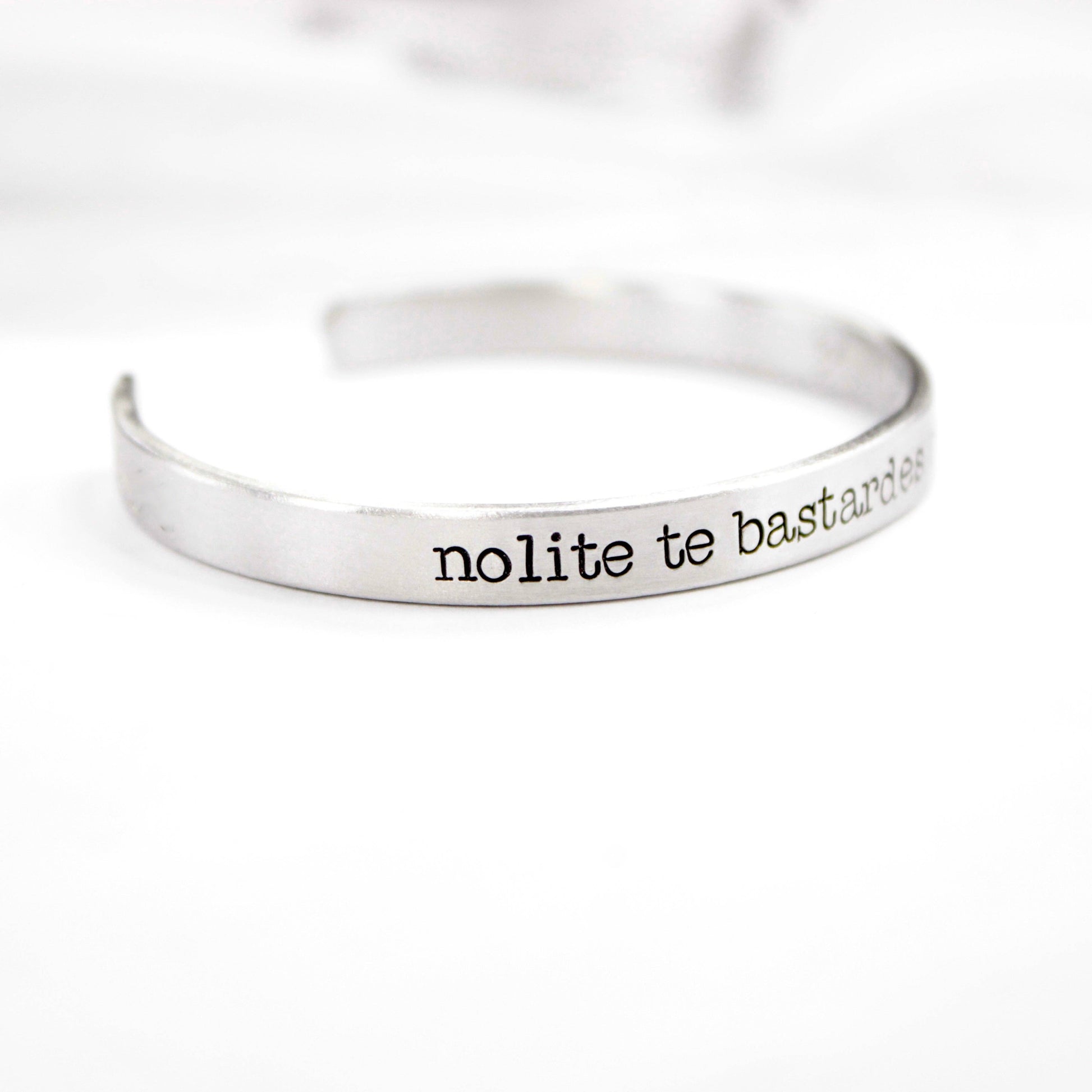This 1/4 inch wide cuff bracelet is stamped with "nolite te bastardes carborundorum", which is an interpretation of "Don't let the bastards grind you down" in Latin.