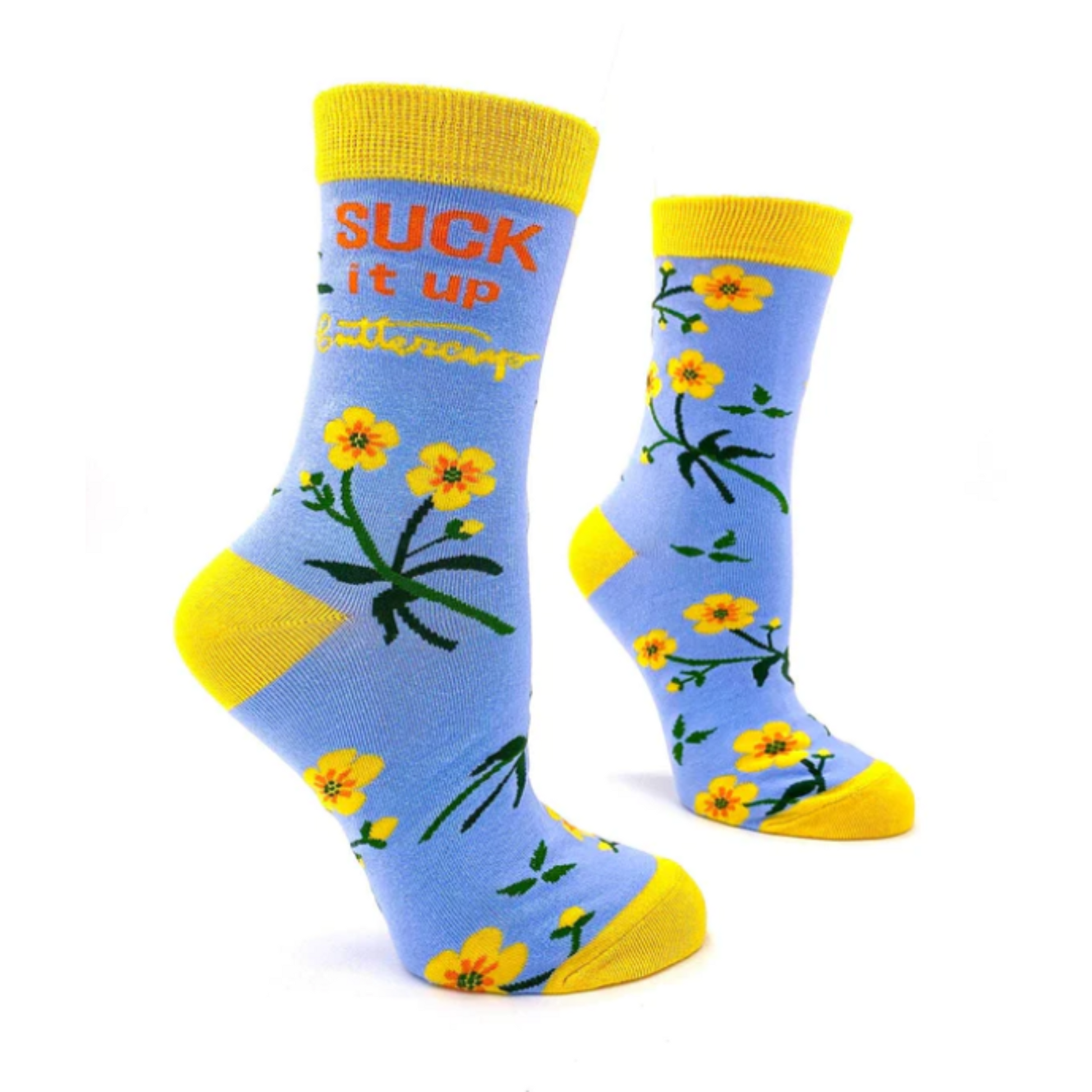 Suck It Up Buttercup Women's Novelty Crew Socks. Stylish and comfortable! Fits ladies' shoe size 5 to 10.